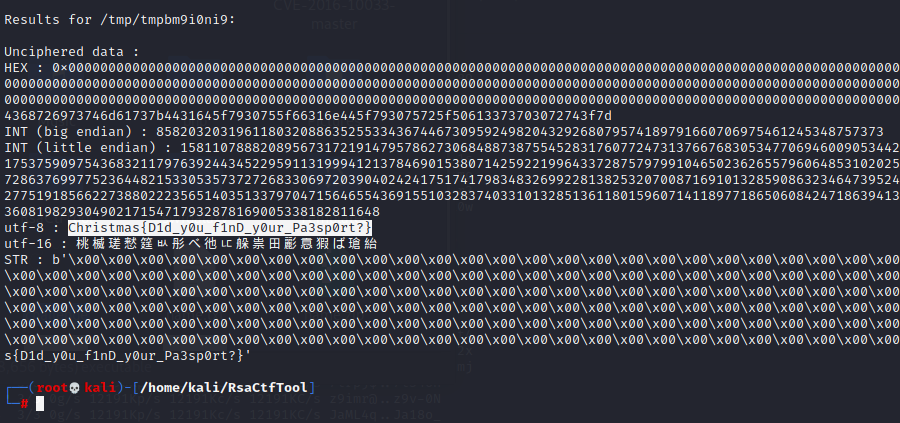 python3 RsaCtfTool.py -n 15418152892607352670726779453104492159030823601102923034887223619599420214365854362547222415232578972321402313365345456611125976119576376028173874636648164525025217815074934755005703994343699279425620518986613084415826219659636762426998085583889268036141848389564061029937847824954259914625563761807325252396800215568344747654733200871951437148543964901558483985352632105578535797462422615402989941799788668870511295281937619419517694470516639111334457574519662593713149139190698436341088773892709083650646454760846045979331703637002946149686156399404797375920722741630669366715487262832057855782192888781534106494517 -e 65537 -p 130783778303010010110492164476991939047910854853219547762631527862056465880703917794384668821885058841319228346234324546822304903987646138003862070025543937556271789218692909468449392252066173363930460229624215836261330682144434384055842615553160051062905455668080350239746220766182392285792704472339032205921 -q 117890407301778506217222406532644946292179579868701560342212789813915501759366350648868156661193294566367426411876005862929164989446500938803139548797759131121293649415291291733630361453936793791636335108652914819173491912852021621501665214411605719598187288970046947402626143768707326215929062138383216366677 --uncipher 13273391952920458943509137299532401854555882021411009525396691663790028388846905869392714575571518621211649914662336276814433688977793743560828354429096970890300677056418379588286085644837633867547577880701020602837610285710580403578750977516628605086982281716390227362113966035625031885787496545390380593064916717354451104714050829234006269097298606441993548442155185029550949631530259100552019161736827582814987904654795312867454180251044607521429139311956183748509908447898279202145113702058720629181148772279091956696873618983350918352419053598549791029235941380073809329257421142692819812828055098954344378802676