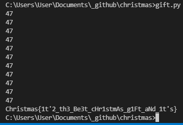마찬가지로 Christmas{ 플래그 시작 부분과 비교했을 때 두 차이의 절대값이 47임을 확인하고 소스코드를 짯다.